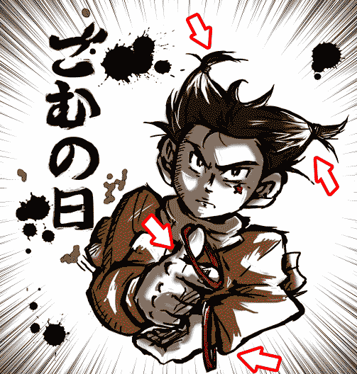 5月6日 → ゴムの日じゃん → ゴム鉄砲!→ …指でゴム銃ズギューン!! → 銃といったら? → ゴルゴ13…? → 劇画…?? → …???? → なんじゃこりゃ → あっ、もう5月6日終わってる!! 一応普通に塗ってたんですが、色数少ない方がよいような…